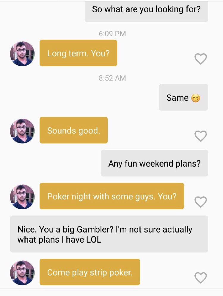 Fellow Bumbler, Danielle, had this little gem to share. Nothing says I’m looking for a long term relationship like an invitation to play strip poker! He’s a keeper!