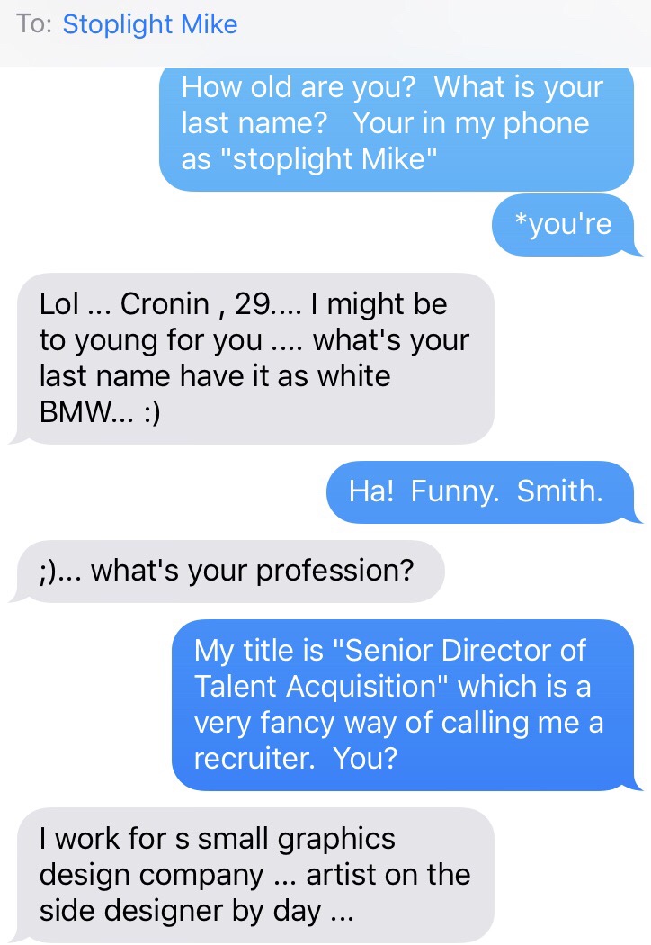 The 23 year old me would have totally ignored the red flags with Stoplight Mike. But the 43 year old me didn’t! (I just totally high fived myself. You GO girl!). The story: I was at the intersection of Westport Rd. and Hurstbourne Lane around 7 AM. I see, out of the corner of my eye, some dude, in the lane next to me, waving furiously. I roll down my passenger window (actually I rolled down my back passenger window first because I got the buttons confused and I’m just cool like that). This guy, Mike, talks to me, gives me a few compliments and asks for my number. When I said no, he asked me to take his. Eh, fuck it, I’ll take your number Stoplight Mike!